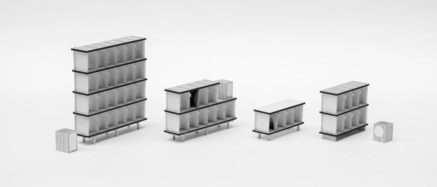De berkenhouten planken en aluminium panelen zorgen voor een sterke constructie die toch heel licht oogt. Met handige tabbladen waarmee je je platen eenvoudig kunt organiseren. Ons modulaire systeem groeit mee met je collectie, zodat je in de loop der tijd extra lagen kunt toevoegen om je groeiende verzameling een plek te geven.